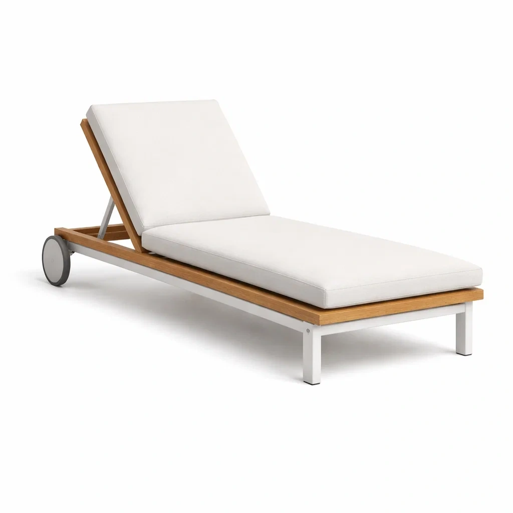 Chaise longue extérieure en bois avec coussin réglable en tissu beige