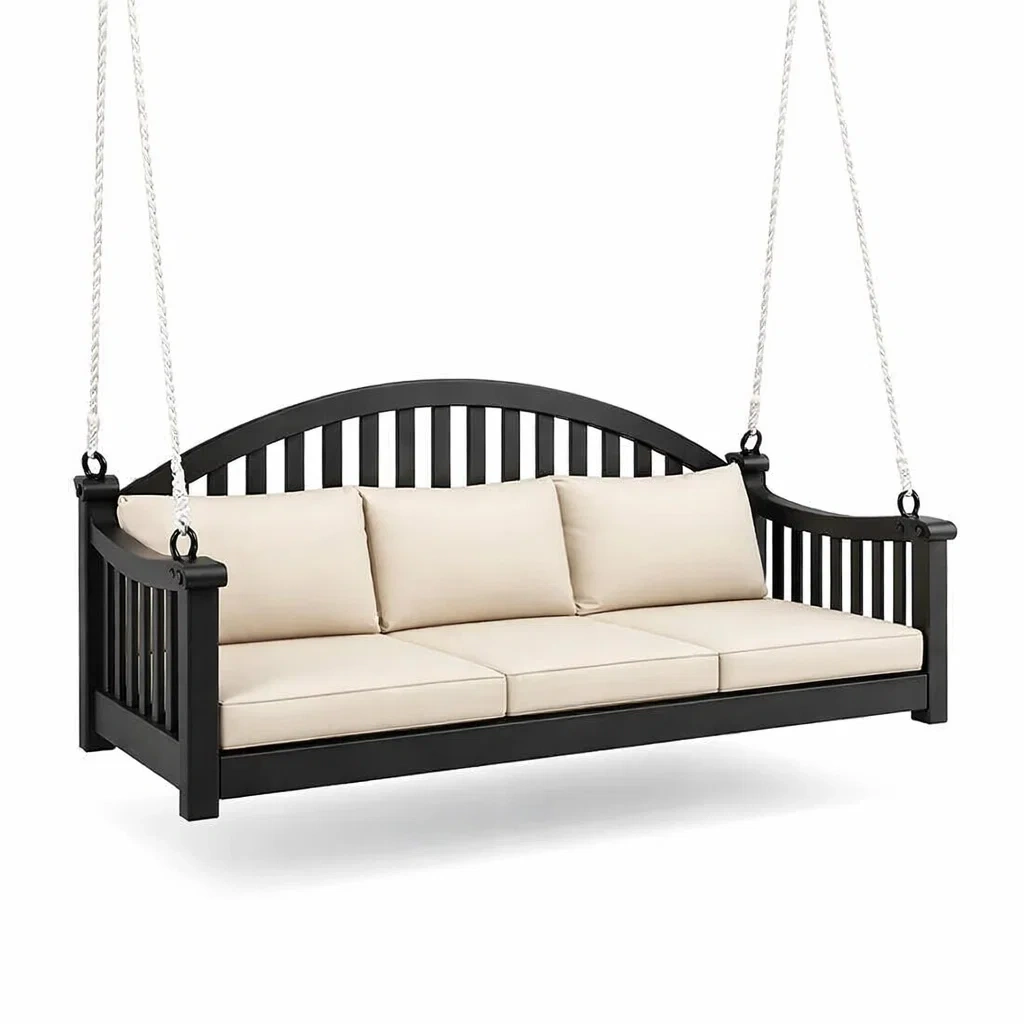 Balancelle de porche en bois avec coussins noir et beige