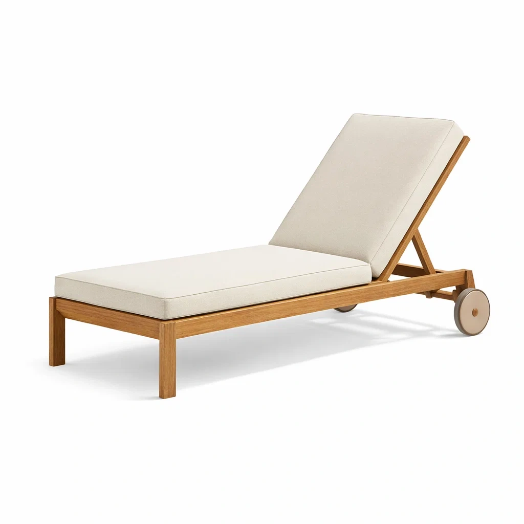 La chaise longue possède une structure en bois massif de teck verni. Les coussins en polyester résistant à l'eau sont de couleur écru. Dimensions : 200 cm de long, 70 cm de large et 35 cm de haut, avec une épaisseur de coussin de 5 cm. Le dossier est réglable sur plusieurs positions et les roues permettent un déplacement aisé. Poids net : 15 kg.