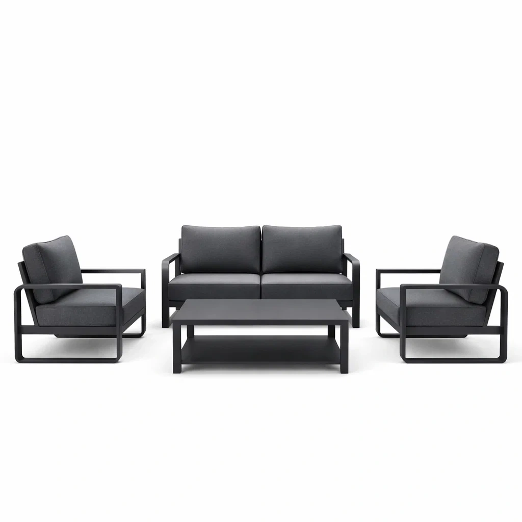 Le salon de jardin comprend une structure en aluminium et des coussins en tissu polyester de couleur grise. Dimensions : canapé deux places : L 140 cm x P 75 cm x H 80 cm, fauteuil : L 75 cm x P 75 cm x H 80 cm, table : L 100 cm x P 50 cm x H 40 cm. Capacité de charge : 150 kg pour chaque siège.