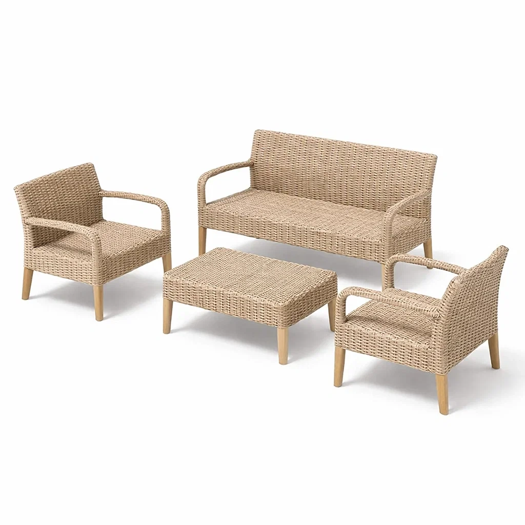 Ensemble de mobilier de jardin comprenant 1 canapé, 2 fauteuils et 1 table basse en rotin synthétique tressé. La structure est en bois de hêtre. Le canapé mesure 120 cm x 70 cm x 80 cm, chaque fauteuil mesure 70 cm x 70 cm x 80 cm, et la table basse fait 90 cm x 50 cm x 40 cm. Capacité de charge du canapé : 150 kg. Capacité de charge des fauteuils : 100 kg chacun. Assemblage simple requis. Nettoyer avec un chiffon humide, éviter les produits chimiques abrasifs.