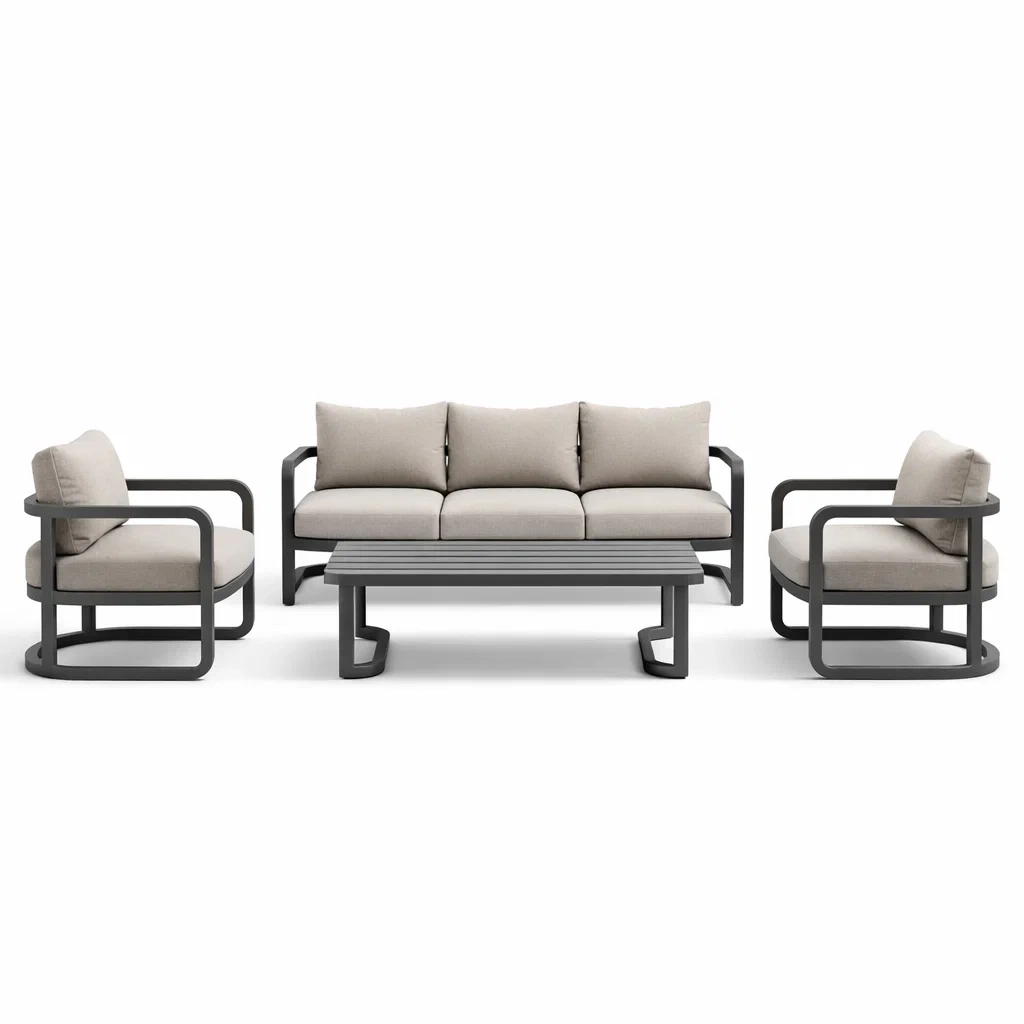 Matériau : Structure en aluminium, coussins en tissu polyester avec rembourrage en mousse.