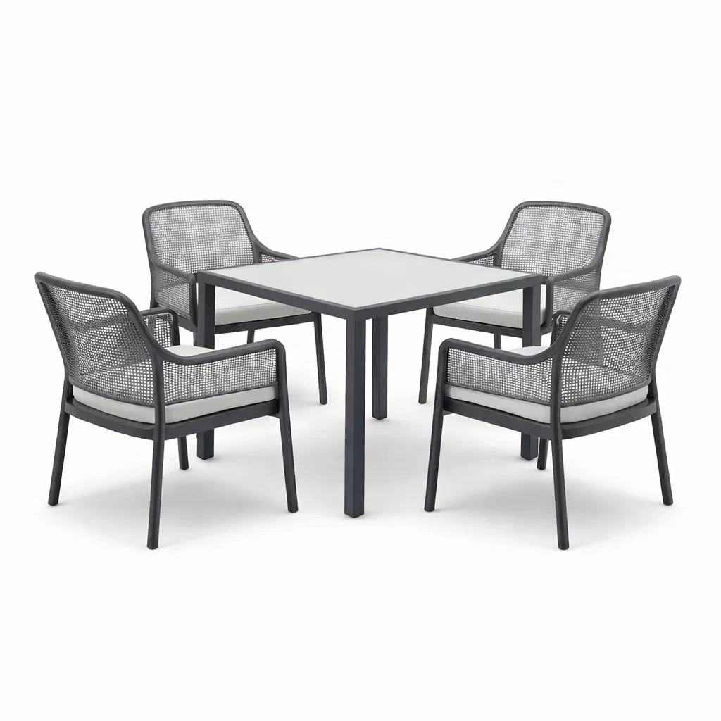 Matériaux : Structure en aluminium, assise en textilène, plateau en verre trempé 5 mm.