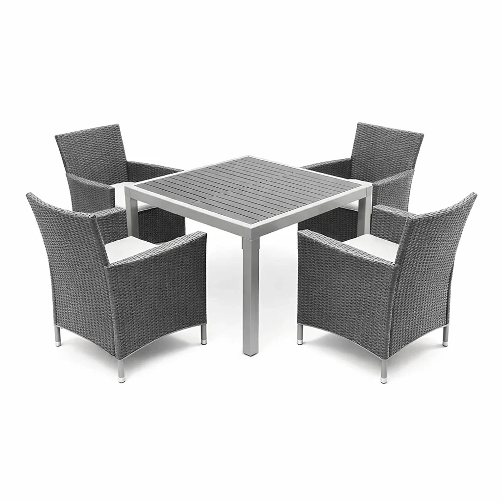 Ensemble de mobilier de jardin composé d'une table et de quatre chaises. La table est en aluminium avec un plateau en lattes d'aluminium. Les chaises sont en rotin synthétique sur un cadre en aluminium avec des coussins en mousse.